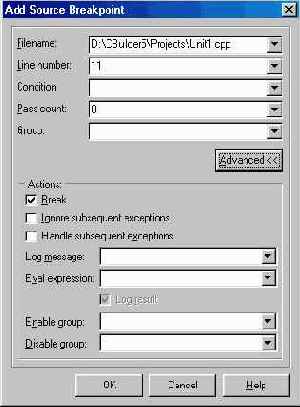 Контрольные точки со счетчиком проходов можно считать разновидностью условных. Требуемое число проходов вводится в поле Pass count. Если число проходов установлено равным п, остановка программы произойдет только на п-ом проходе через контрольную точку. Точки со счетчиком удобны при отладке циклов, когда вам нужно выполнить тело цикла определенное число раз и только потом перейти к пошаговому выполнению программы.