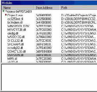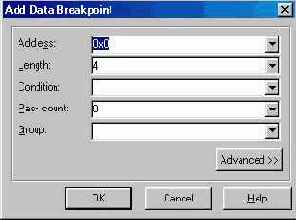 Адресные контрольные точки во всем аналогичны точкам в исходном коде за исключением того, что при их установке указывается не строка исходного кода, а машинный адрес инструкции, на которой нужно приостановить программу. Такие контрольные точки полезны, если ваша программа завершается аварийно. В этом случае Windows выводит панель сообщения, в которой указывается адрес инструкции, вызвавшей ошибку.