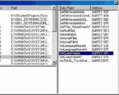 Панель вверху слева показывает список модулей. Для выбранного модуля панель слева внизу показывает исходные файлы, входящие в его состав. Панель справа отображает список входных точек (глобальных символов) модуля.